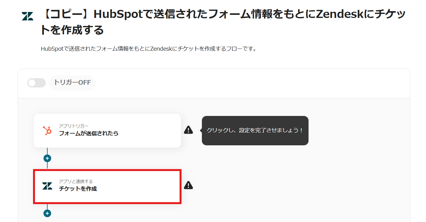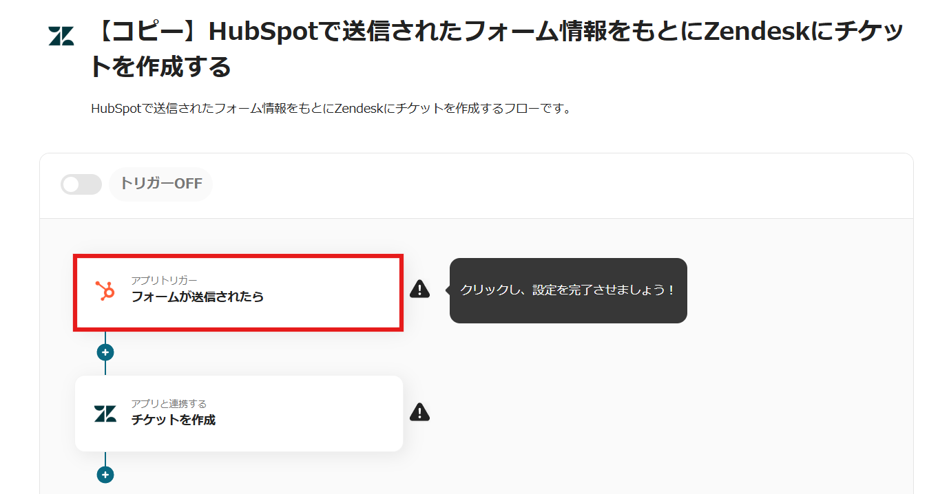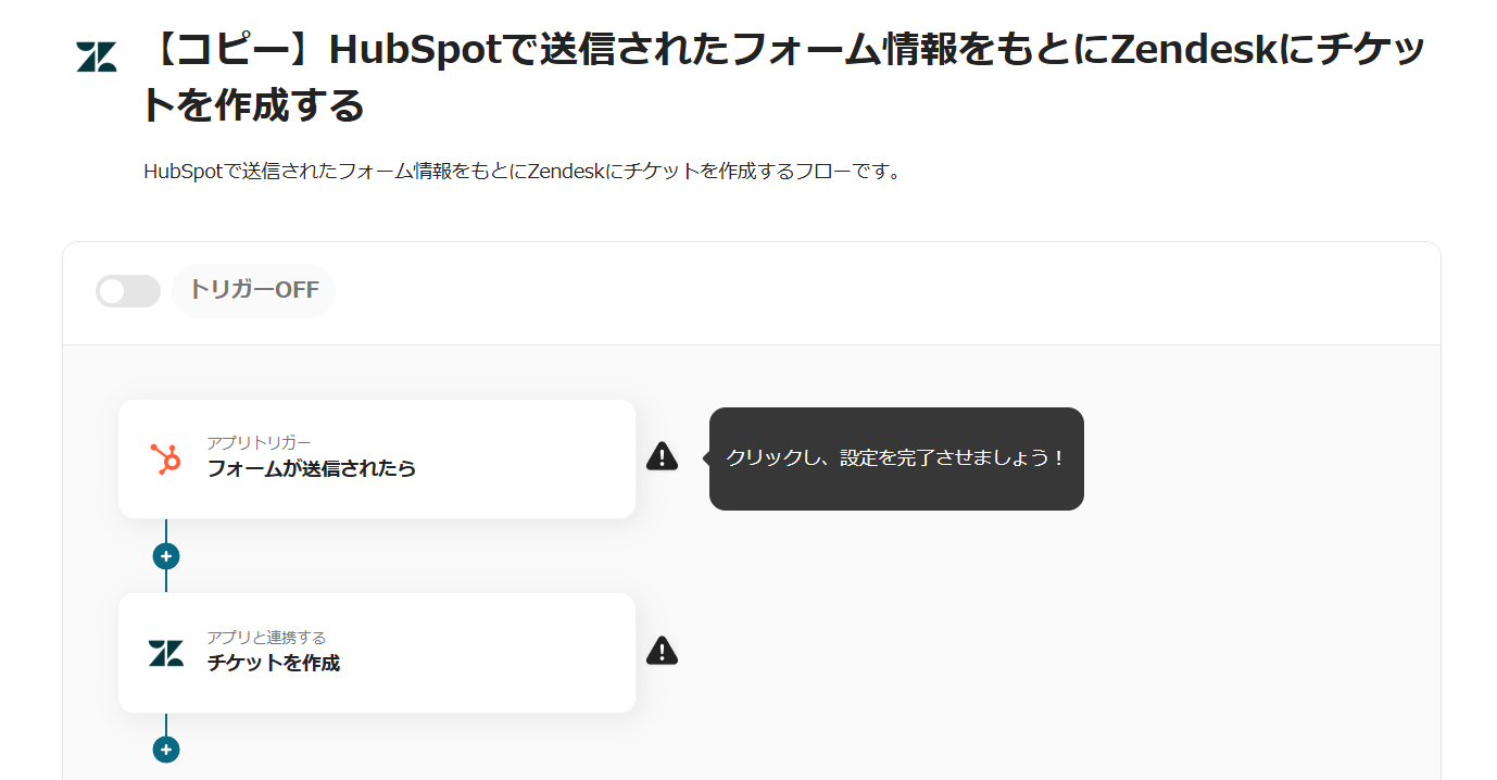 ・トリガーボタンをONにして、HubSpotとZendeskの連携動作を確認