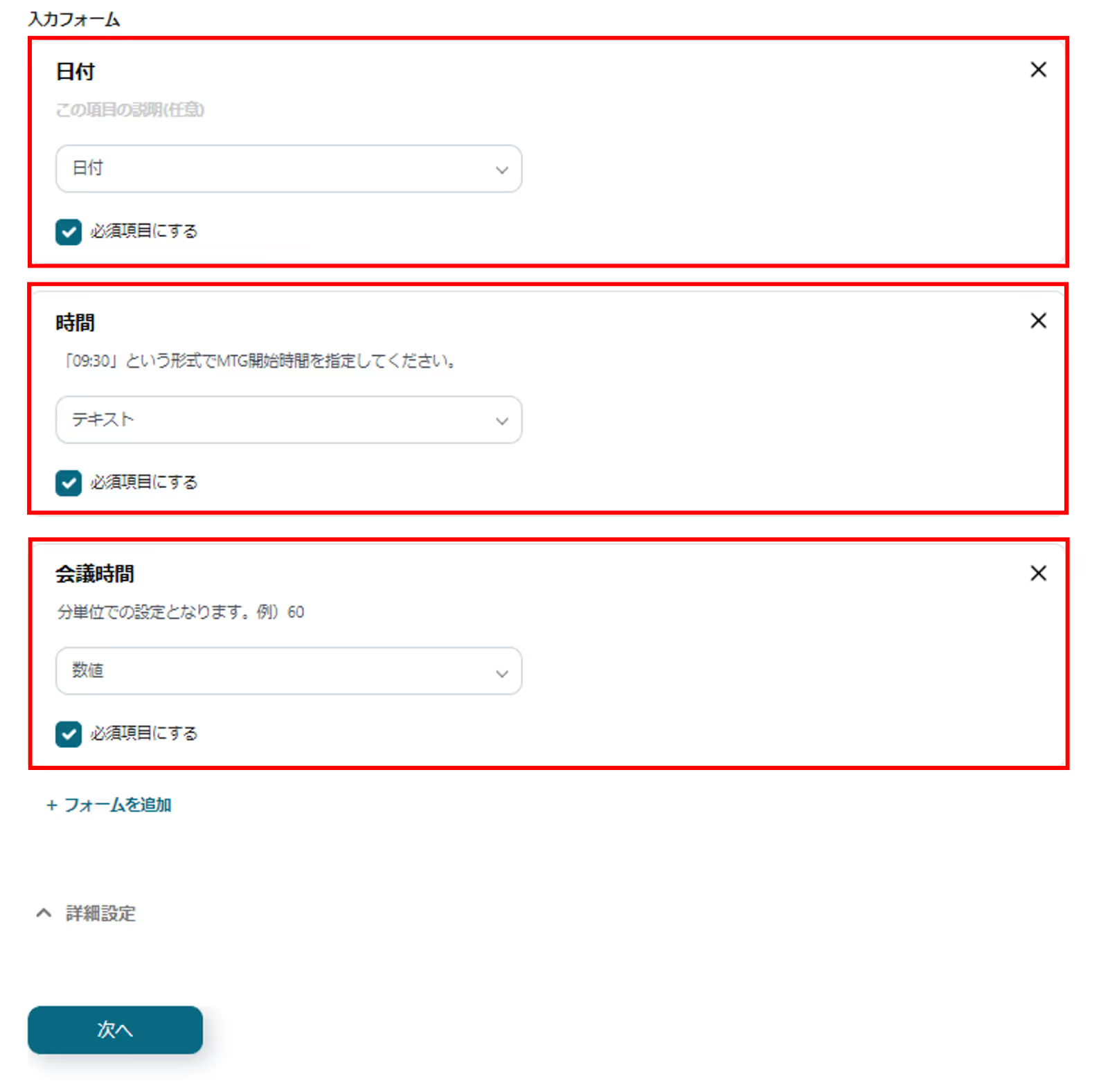 入力フォームにある+フォームを追加をクリックして、必要な項目数を追加します。