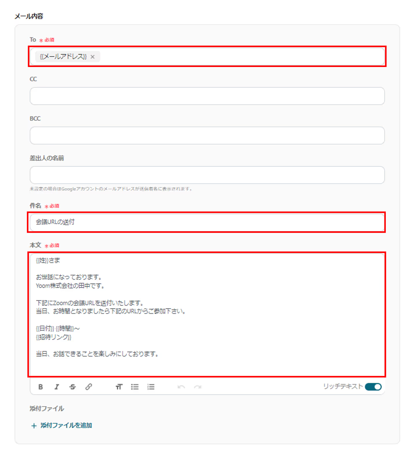 Zoomの会議情報の設定やGmailのメール内容を自由に変更してご利用ください。