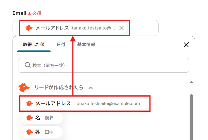 テストに成功すると、「取得した値」に最も新しいリードの情報が追加されます。 【Tips】 以下の画像に表示されている取得した値=アウトプットは、この後のLoopsの設定時に利用できます。 また、アウトプットを利用して設定を行った箇所はフローが起動する度に自動で最新の情報で登録されます。 詳しい説明は こちらのヘルプページ をご覧ください。