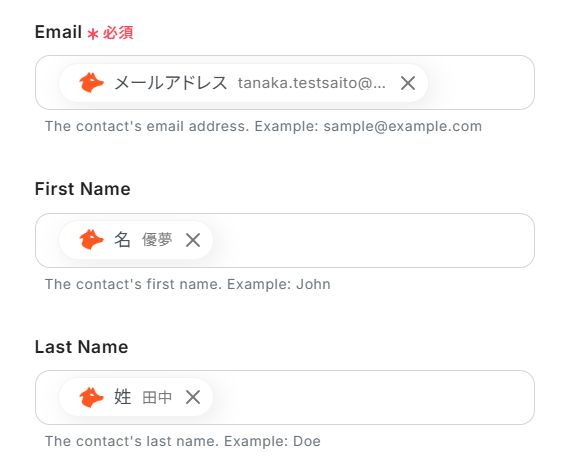 各項目にHunterから取得した値を設定していきましょう。 入力欄クリック時に表示されるトリガーアクションメニューから、対応する取得した値=先ほど取得したアウトプットを選択してください。