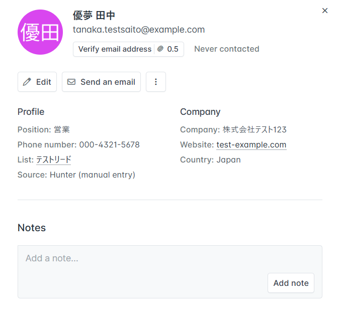 設定のテストで必要になるため、Hunter(の指定したリードリスト)にテスト用のリードを作成してください。 ※ テスト用リードの例