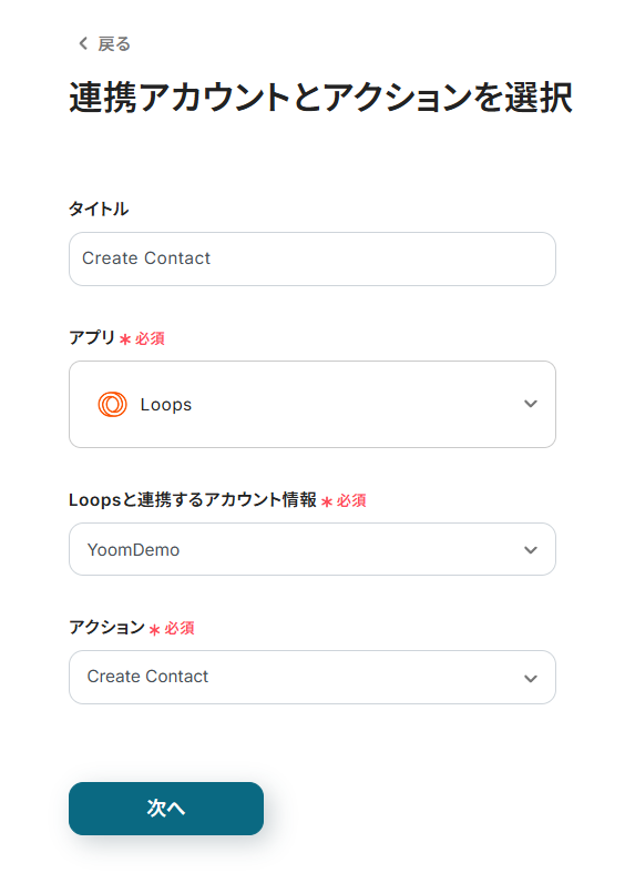 適宜「タイトル」を変更。 連携アカウントとアクションを確認し、「次へ」をクリック。