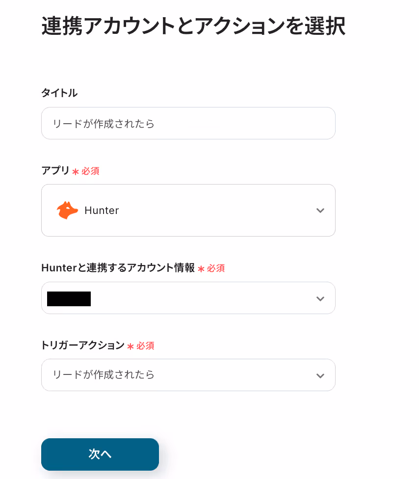 まずは、Hunterでリードが作成された際に、フローが起動するように設定を行います。
