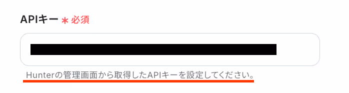「APIキー」は、Hunterの管理画面で取得したAPIキーを設定します。