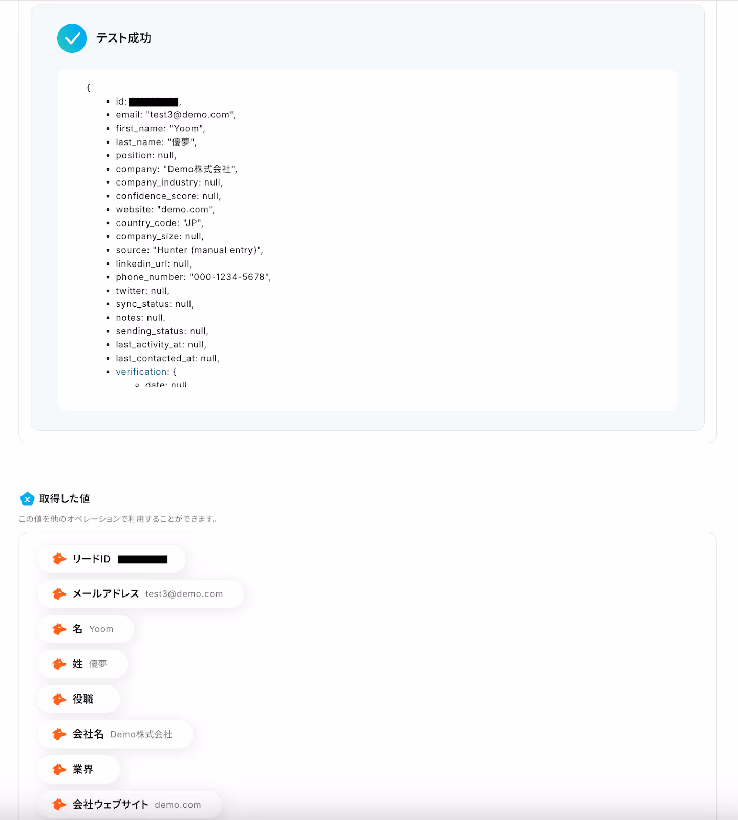 テストが成功すると、先ほど作成したリードの情報が「取得した値」に抽出されるので、内容を確認してください。