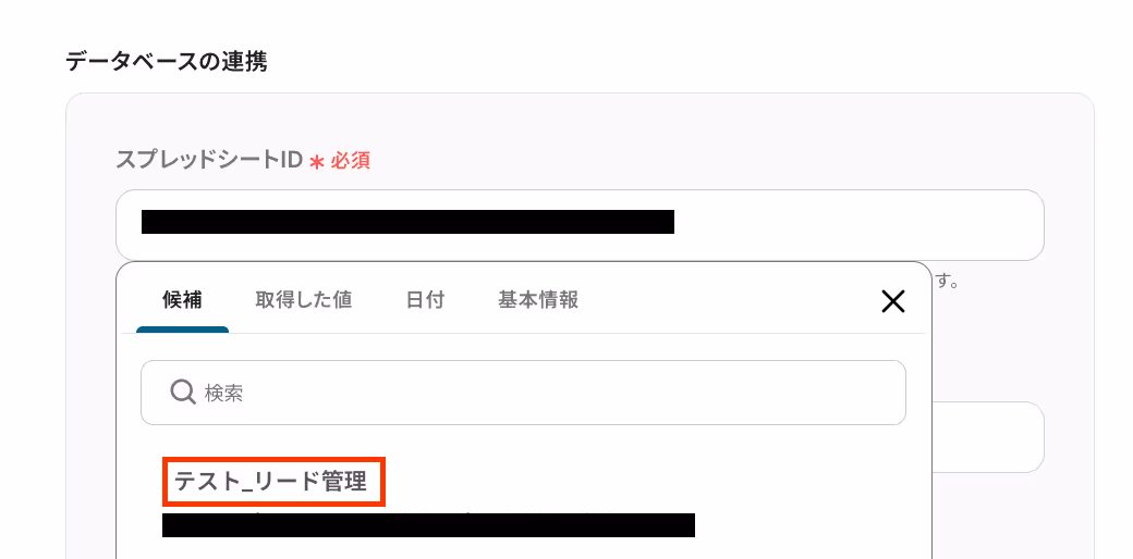 データベースの連携設定では、「スプレッドシートID」と「スプレッドシートのタブ名」を、入力欄をクリックして表示される候補から選択してください。