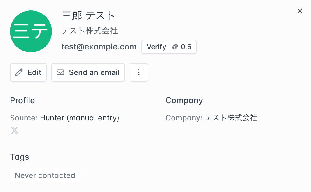 事前準備としてHunterでリードを作成しておきましょう。今回はテスト用に、以下の内容で作成しました。なお、リードにはX(Twitter)のユーザー情報も登録しておきましょう。