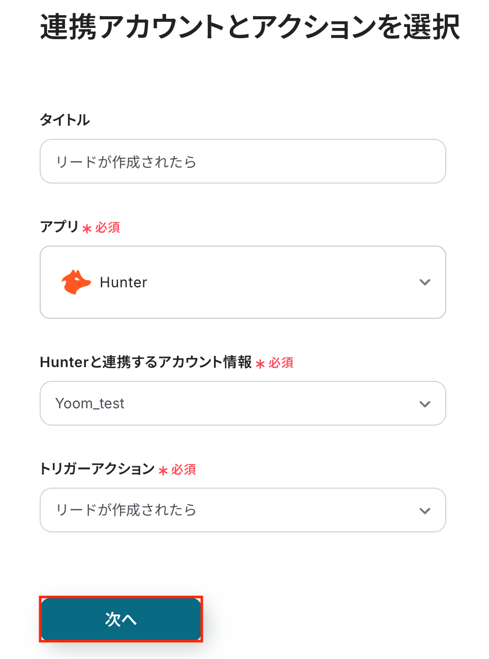 Hunterと連携するアカウント情報に問題がなければ、「次へ」をクリックします。
