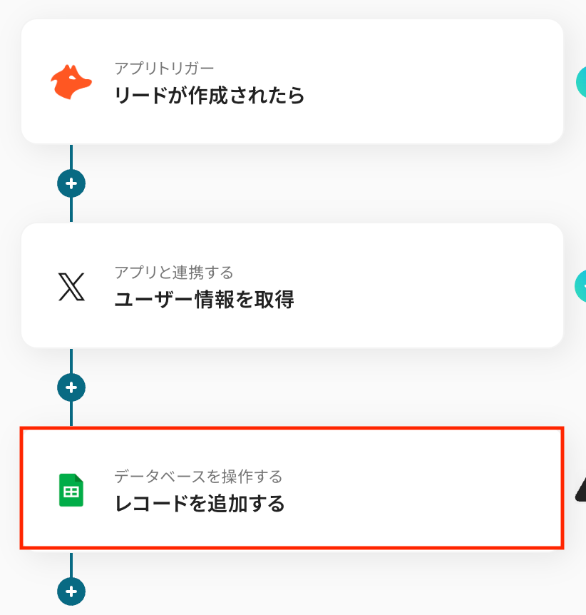 フローボットで設定しているGoogle スプレッドシートのレコードを追加のアクションを削除し、代わりに目的のアプリを設定してください。各アプリのアクション項目から「レコードを追加」「レコードを更新」などを組み合わせることで、普段利用しているCRMやSFAに直接データを反映させるフローを作成できます。