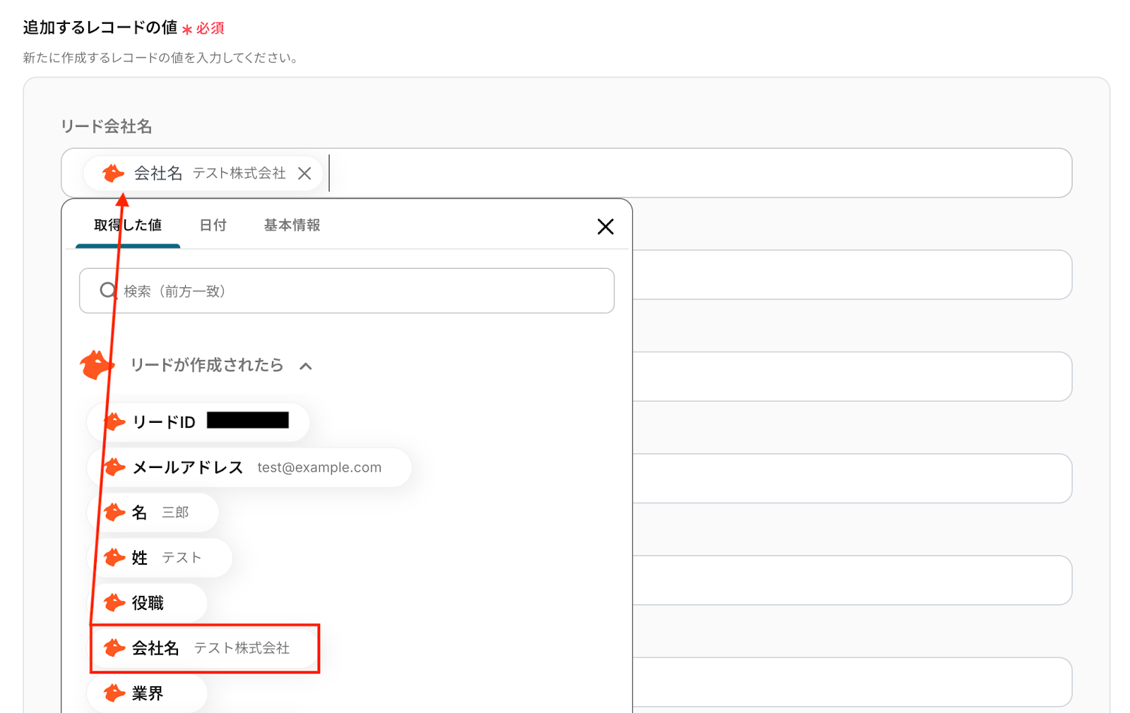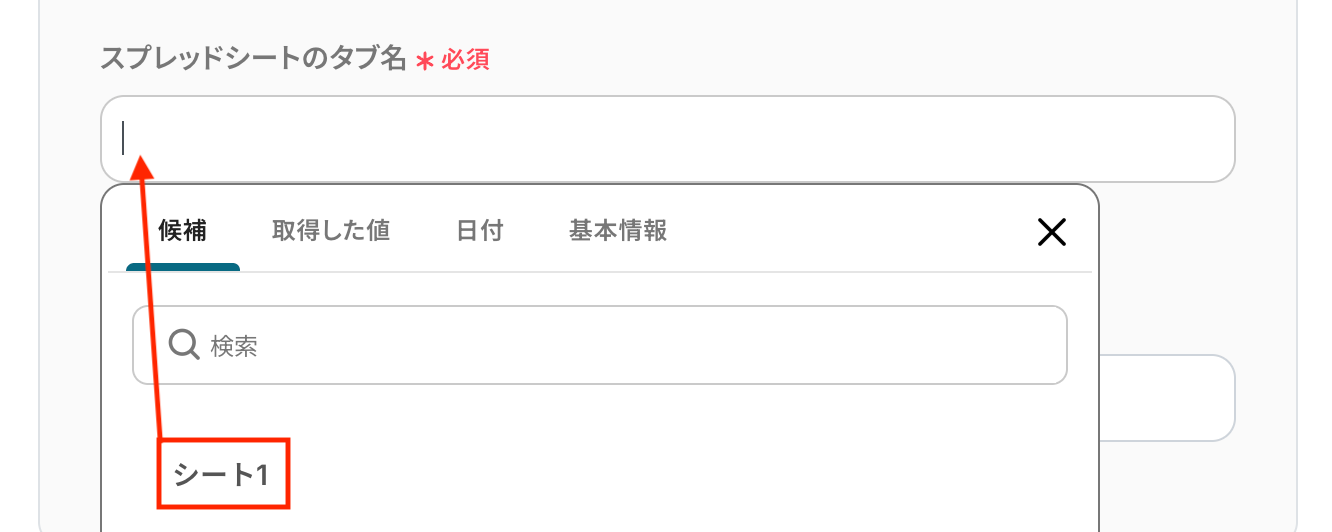 入力欄をクリックすると前のステップでHunterから取得した値が表示されるので、選択して入力しましょう。