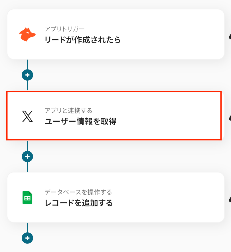 このワークフローを活用すれば、Hunterでリードが作成されると、自動でX(Twitter)のユーザー情報を取得しGoogle スプレッドシートに追加できます。