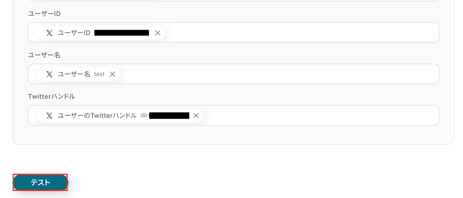 入力が完了したら設定内容とトリガーの動作を確認するため「テスト」をクリックします。