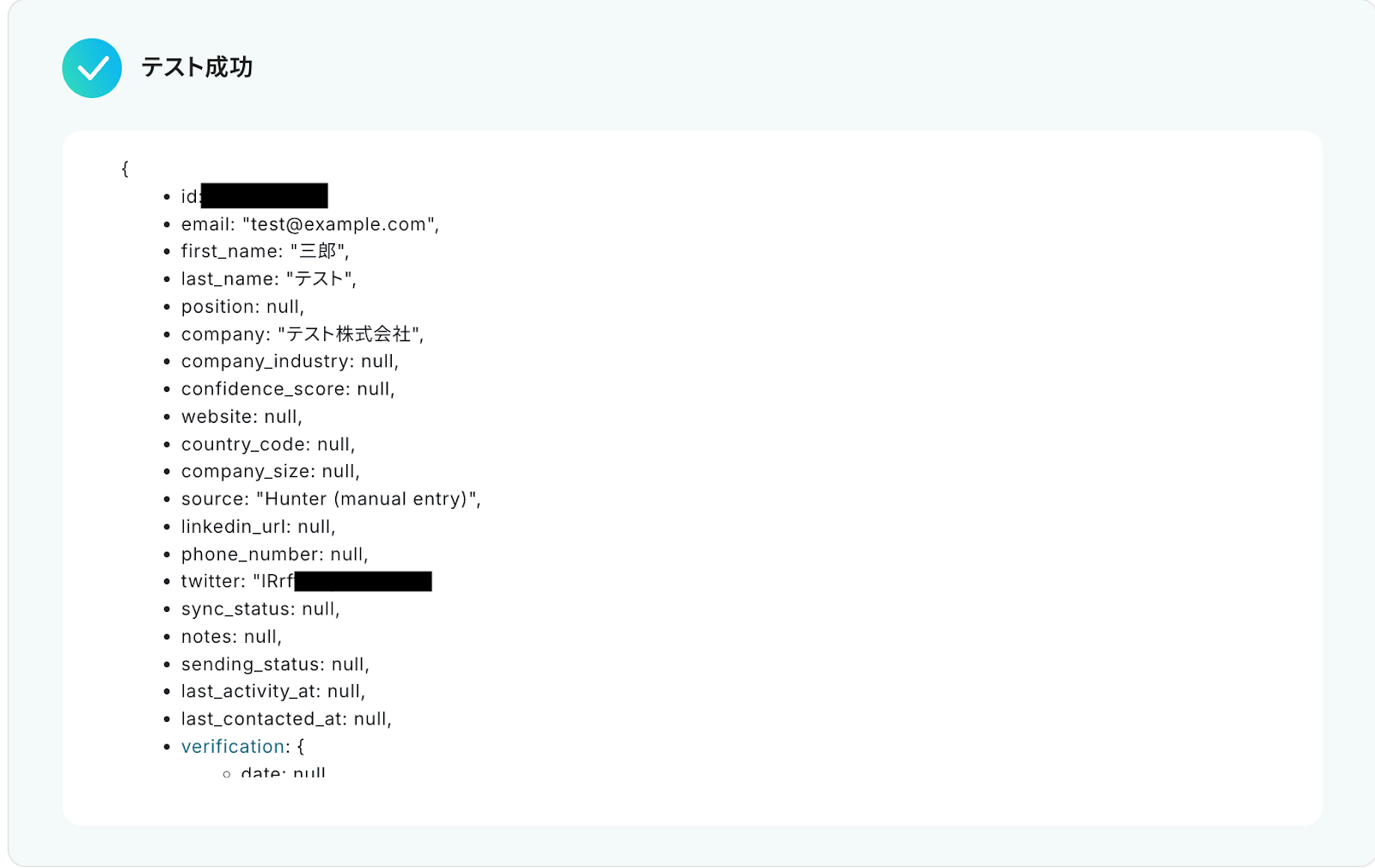 テストに成功すると、Hunterに作成されたリードに関する情報が表示されます。