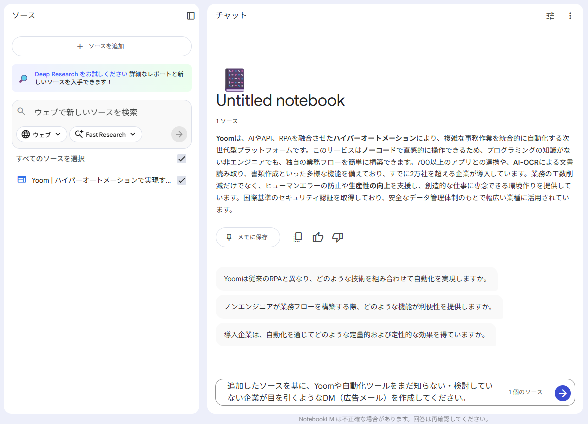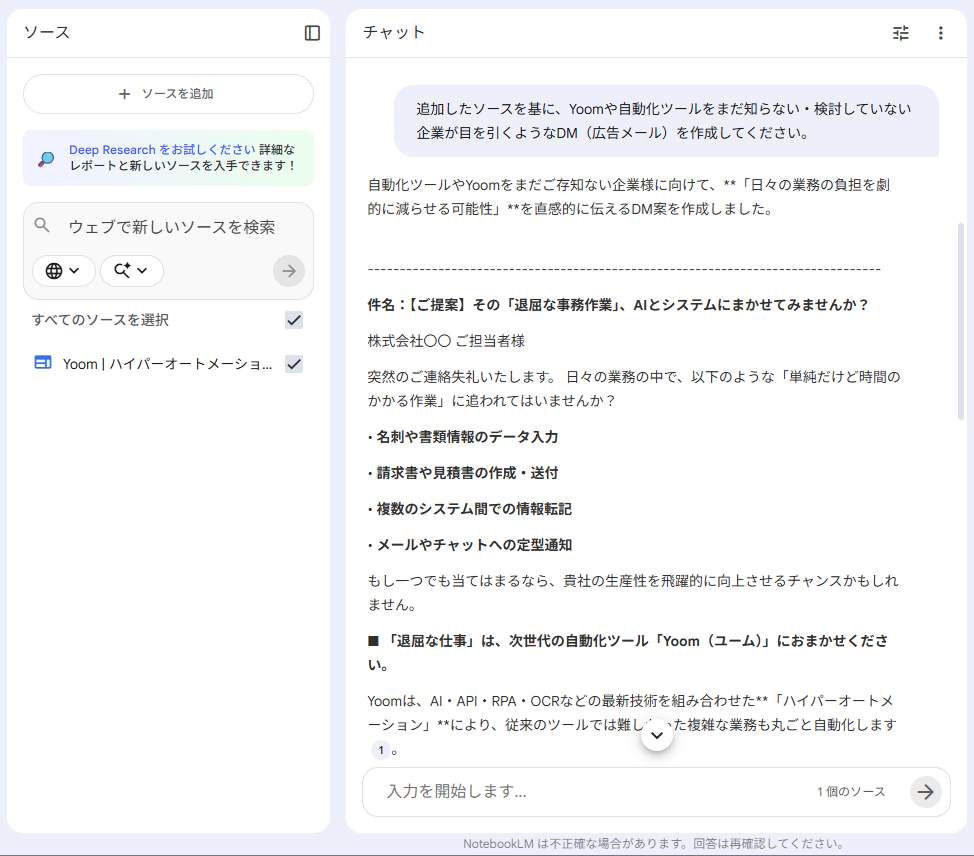 「サイトを基に目を引くDMを」というシンプルな指示だけで、構成案からキャッチコピーまで一気に生成されました。通常、DM作成にはターゲット選定や訴求点の整理に時間がかかりますが、NotebookLMがサイトから主要なサービスのウリを自動で抽出 してくれるため、企画の効率がかなり上がると感じました。