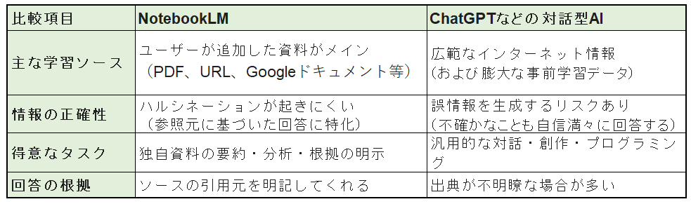 こうしたメール作成業務の効率化に向けて、今回検証を行うのがGoogleのAIツール「NotebookLM」です。ChatGPTなどの一般的な生成AIとは異なり、ユーザーが指定した資料のみを情報源として回答を生成するため、AI特有の「ハルシネーション(もっともらしい嘘)」を抑えられる点が大きな特徴です。