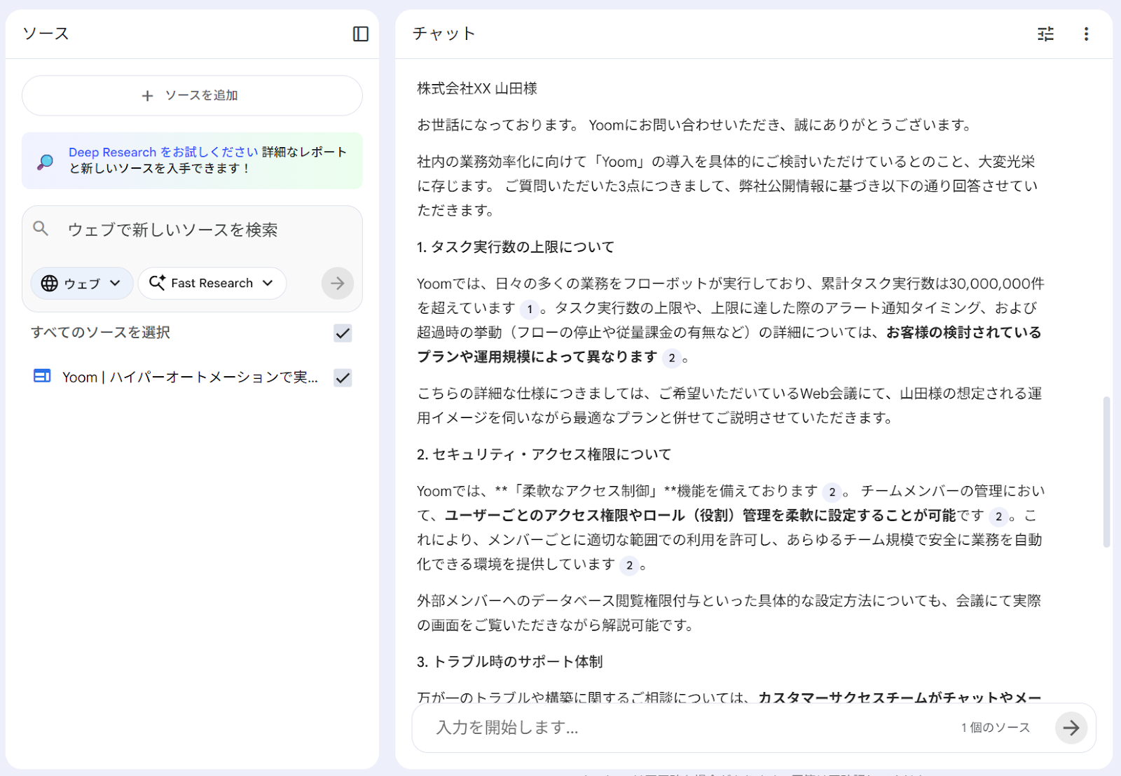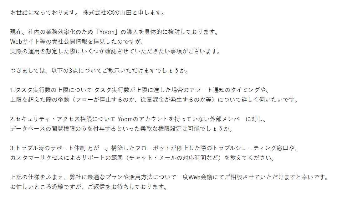 Yoomの導入を検討している企業から以下のメールが届いた。 ソースに追加したサイトを基にメールの返信文章を作成してほしい ◆以下、問い合わせメールの内容 ~