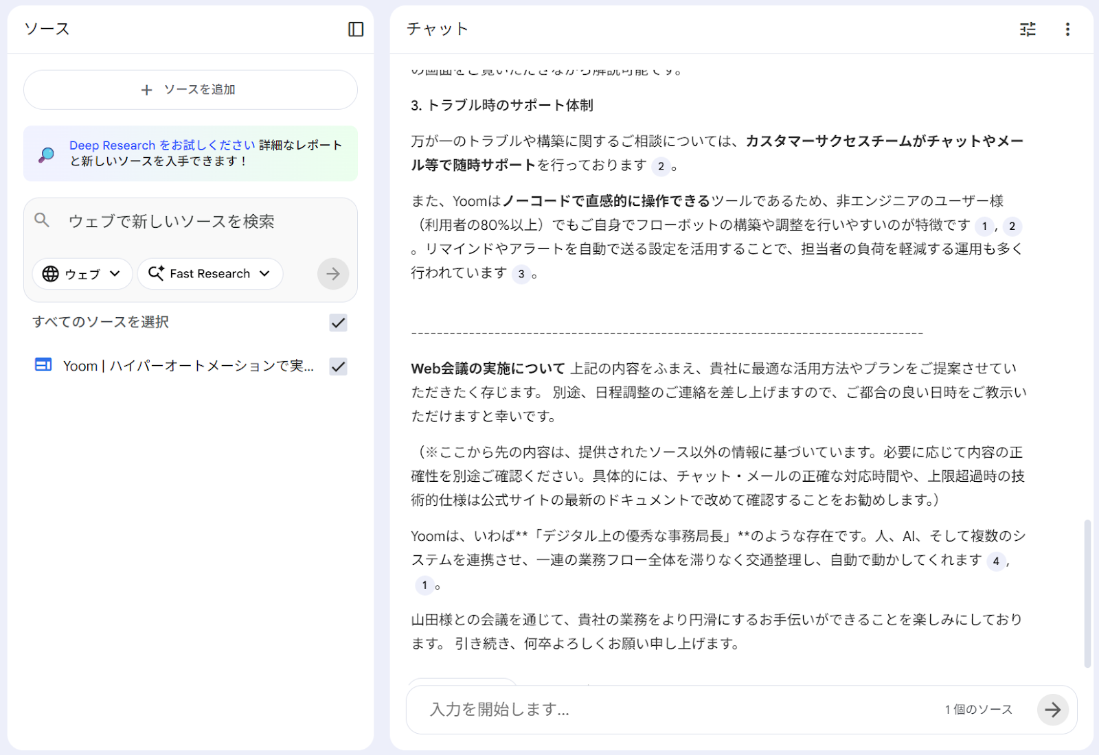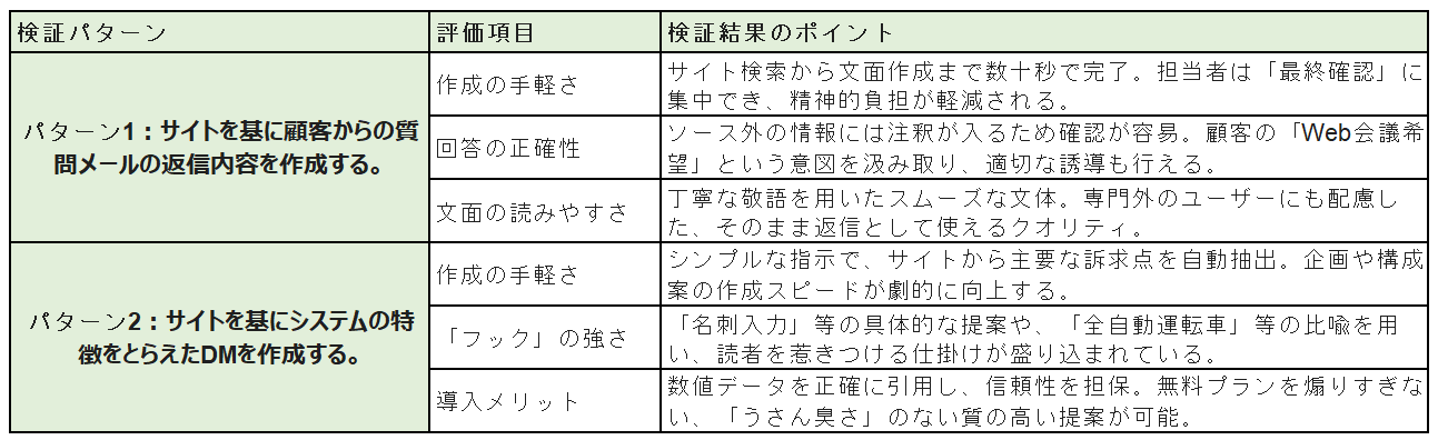 ソースに追加したサイトの情報を基に回答を記載してくれていました。ソース以外の情報については「※ここから先の内容は、提供されたソース以外の情報に基づいています。必要に応じて内容の正確性を別途ご確認ください。」等の記載があり、作業者目線で確認がしやすいと感じます。 また、単にサイト内の情報を抜き出すだけでなく、顧客が求めていた「Web会議での相談希望」という意図を汲み取って回答していた 点に驚きました。説明が煩雑になりそうな技術的仕様については、あえてメール内で無理に完結させず「詳細はWeb会議にてご説明します」と誘導しており、実務に即した対応力が感じられました。