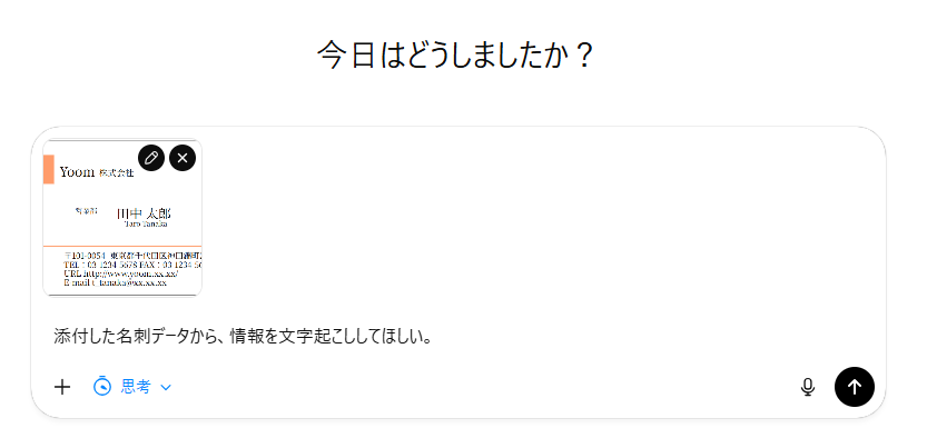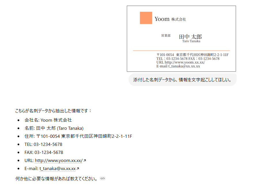 2.名刺の画像より文字起こしを実施 次に名刺の画像から文字起こしを試してみます。今回は検証のために架空の名刺を作成してChatGPTに読み込ませていますが、個人情報などはAIに連携しないように注意しましょう。