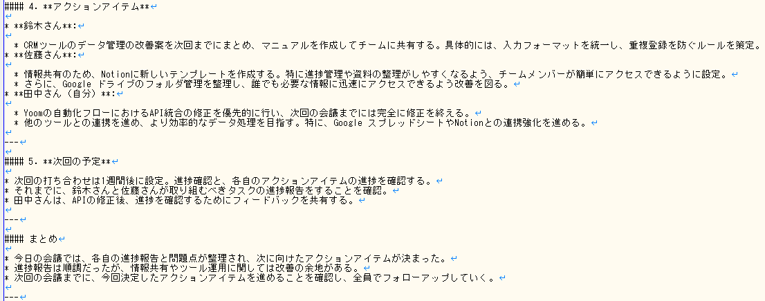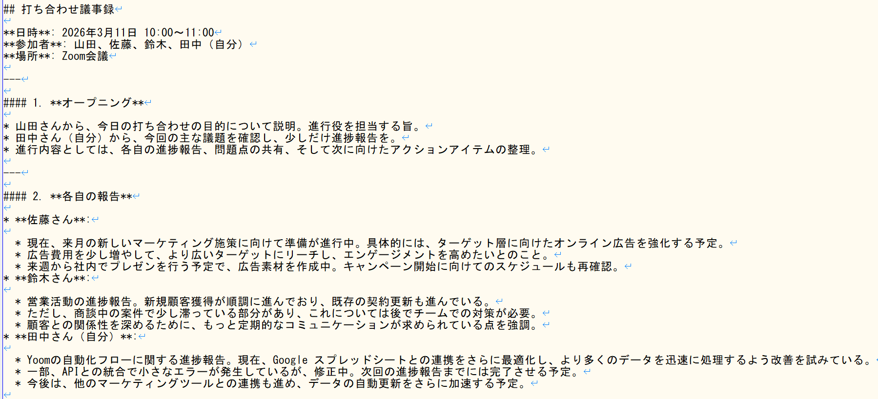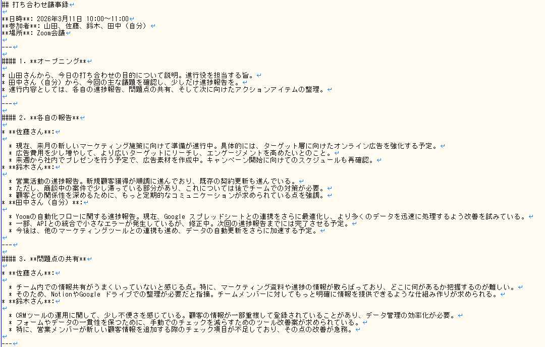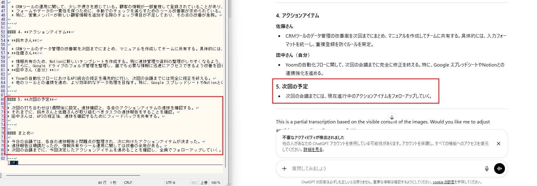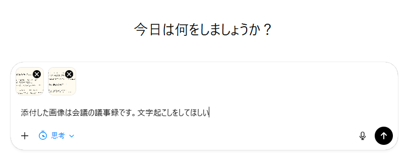 プロンプト 添付した画像は会議の議事録です。文字起こしをしてほしい。内容の省略などは行わず、すべてテキスト化すること 再度試してみた結果、メモに記載のあった内容をすべてテキストに書き起こしてくれました。