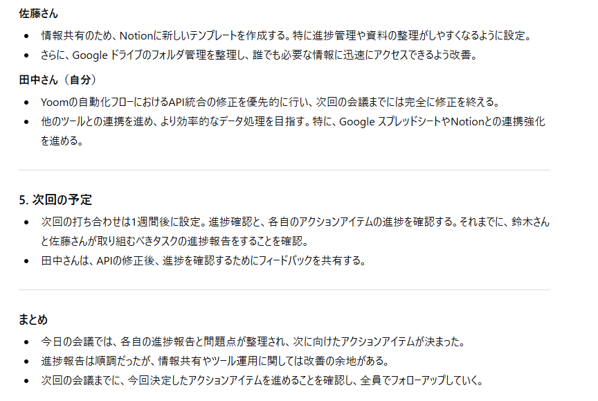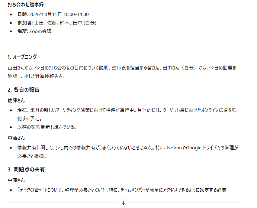 参考サイト:https://biz.moneyforward.com/ai/basic/3791 https://chatsense.jp/function/vision-understanding https://lp.yoom.fun/blog-posts/how-to-summarize-meeting-minutes-with-chatgpt-prompts