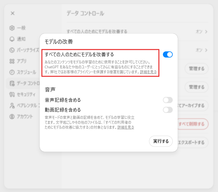ChatGPTの画像文字起こしは非常に便利ですが、ビジネスで利用する際にはいくつか注意すべきポイントがあります。 まず最も重要なのが、機密情報や個人情報の取り扱いです。社外秘の書類や顧客情報が含まれた画像をアップロードする際は、データがAIの学習に利用されないよう、ChatGPTの設定画面から「モデルのトレーニング」に関する設定をオフにしておく必要 があります。 セキュリティに厳しい企業の場合は、エンタープライズ向けのプランや、APIを経由したセキュアな環境での利用を検討すること が望ましいでしょう。