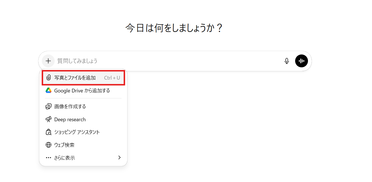 ChatGPTを使った画像の文字起こしは、特別な設定を必要とせず、誰でも簡単に始めること ができます。 PCのブラウザ版でもスマートフォンのアプリ版でも、基本的な操作手順は変わりません。 まずはチャット画面を開き、メッセージ入力欄の左側にある+マーククリックして、「写真とファイルを追加」より、文字起こししたい画像ファイルをアップロードします。