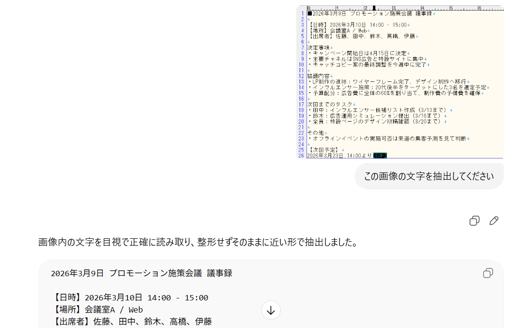 例えば、「画像内の表をMarkdown形式で出力して」「項目は箇条書きで整理して」「抽出したテキストをCSV形式にして」 といった指示を加えることで、その後の業務でそのまま使いやすい形に整えてくれます。