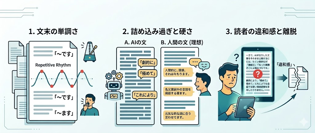 その代表的なものが、AI特有の「機械っぽさ」や「単調さ」による読みづらさです。