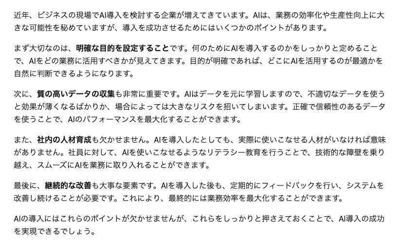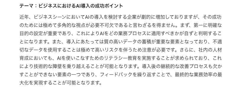 しかし、そのままでは機械的で読みにくい文章になってしまうことも多いため、改善プロンプトを用いた推敲プロセスが欠かせません。