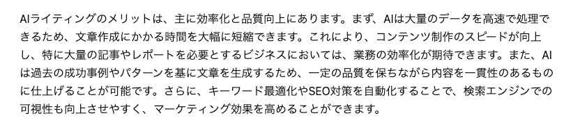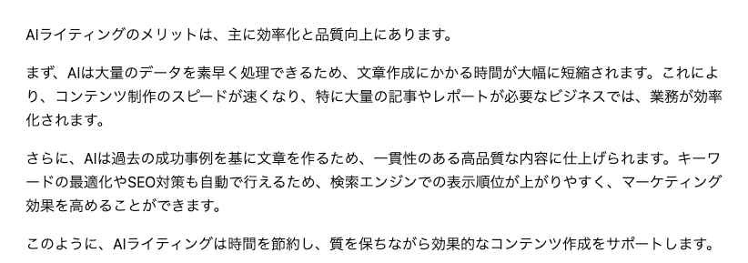 まずは、ChatGPTに「AIライティングのメリット」というテーマでシンプルな指示を出して下書きを生成させ、そこに改善用のプロンプトを複合的に掛けあわせて修正を依頼してみました。