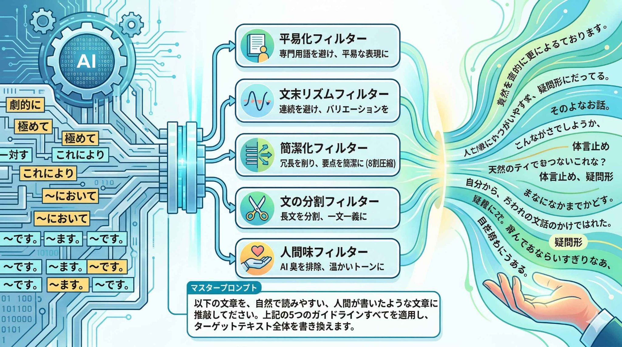 5.AI特有の単語の見直し:「これにより」「さらに」「~において」といった機械的な接続詞や言い回しを、自然な言葉に置き換えてください。