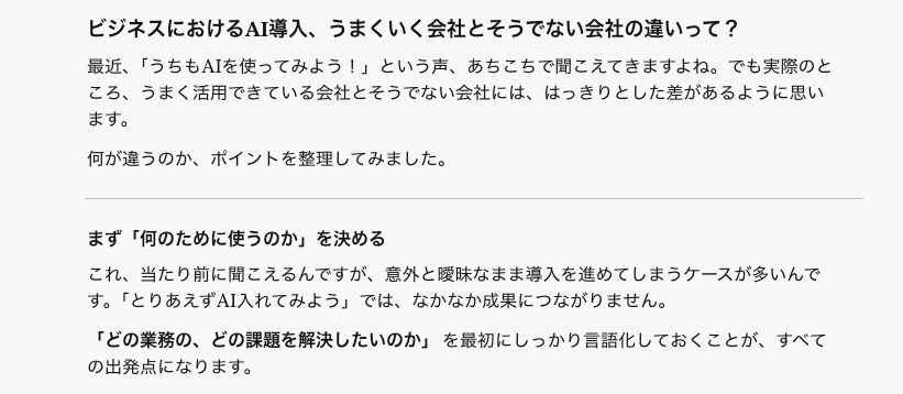 そのため、AIが作成した下書きを、いかに人間らしく、かつ視認性や構成に配慮した「本当に読みやすい文章」へと昇華させるかが、現在のAIライティングにおける課題です。