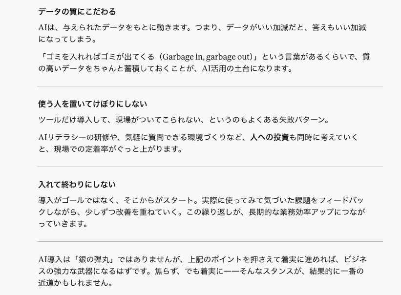 ❗️情報の整理はできても文章のリズムまで完璧にするのは難しい。最後は人間が声に出して読み、文末を整える仕上げが不可欠。