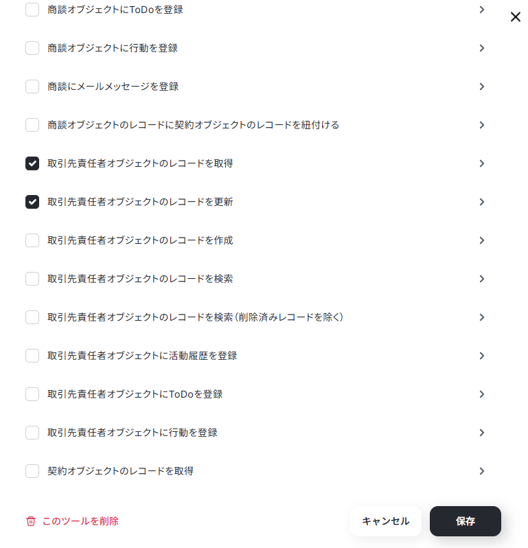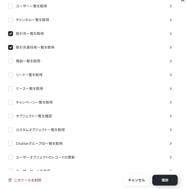 連携するアカウント情報を設定したら、今回は取引先一覧の取得と、取引先のレコードの更新に関する項目の選択を行います。