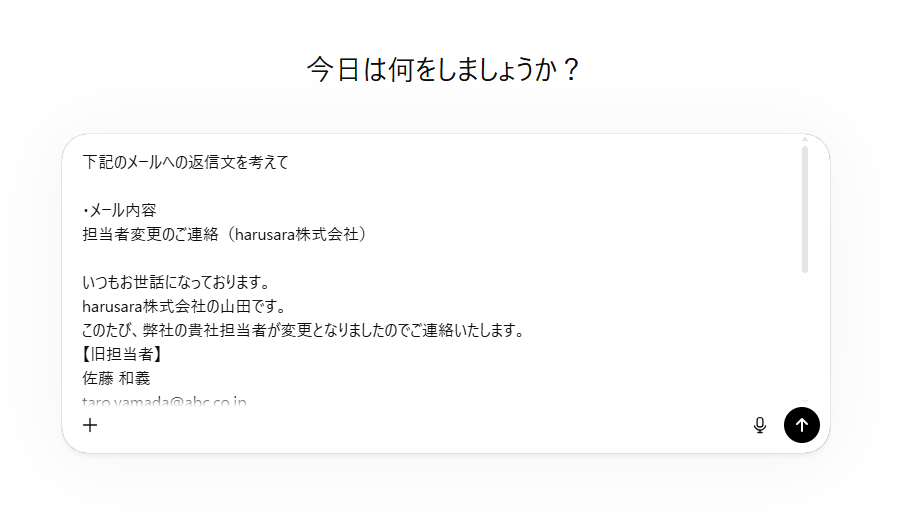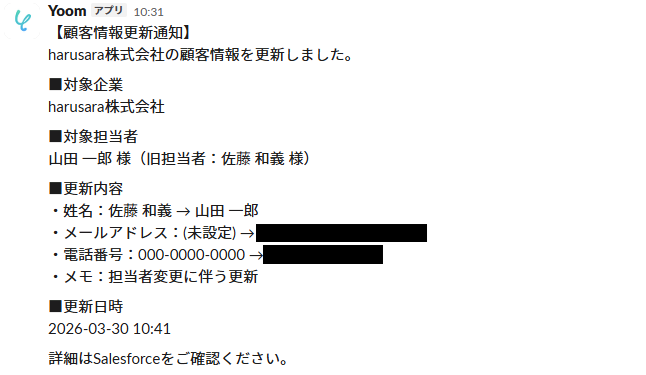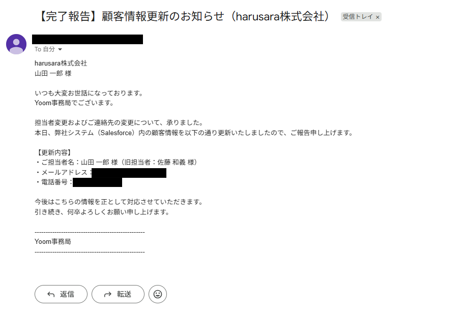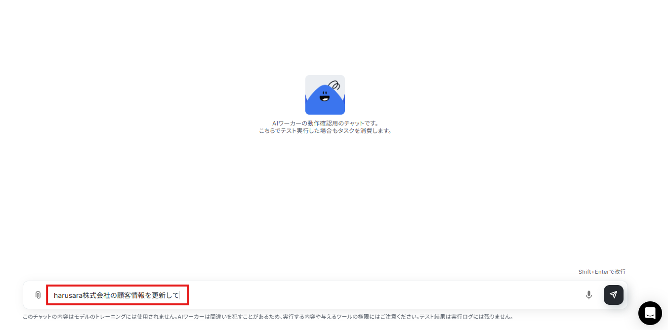 「harusara株式会社の顧客情報を更新して」と指示を送信しました。