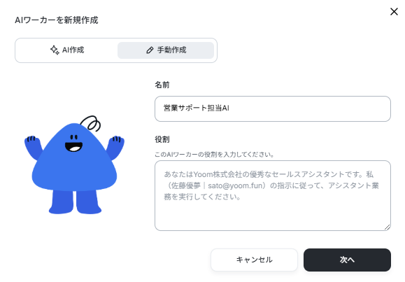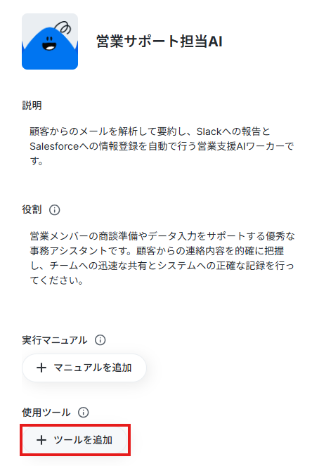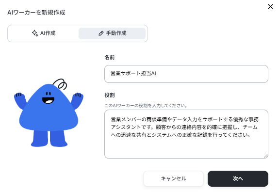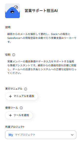 今回は営業チームのサポートを目的とするため、AIワーカーの名前を「営業サポート担当AI」としました。