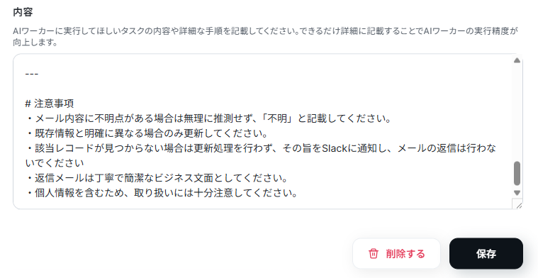 また、「もし氏名が記載されていなければ、修正内容の確認を行う」といった条件分岐を含めておくと、イレギュラーな事態にも柔軟に対応できるようになり、AIエージェントの精度が高まります。