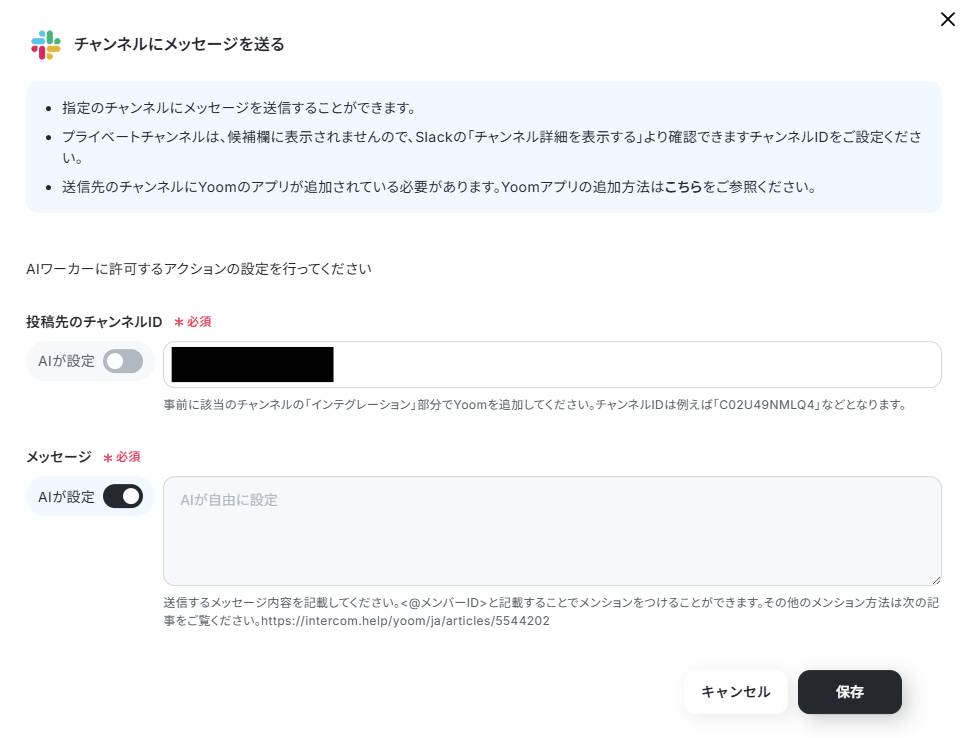 アクションの詳細設定は、通知先のチャンネルIDだけ候補から指定して、メッセージの内容はAIに任せることにしました。