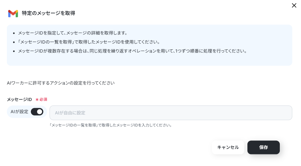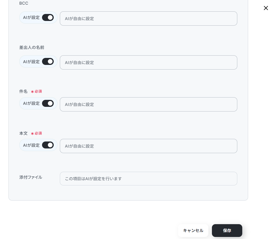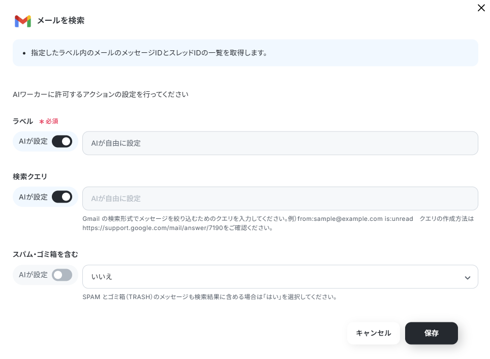 今回は返信を行うメールアドレスと、メールの検索にゴミ箱やスパムを含まないようにする設定だけ実施しました。それ以外はAIワーカーに状況を見て判断してもらいます。