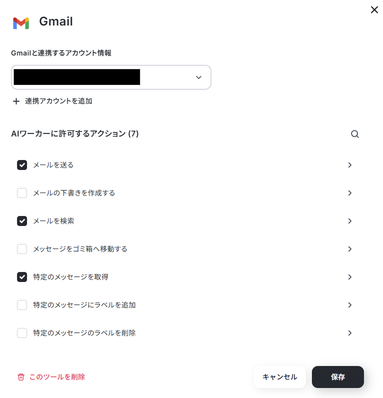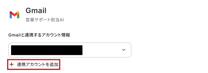 下記は、すでに1つアカウントがAIワーカーと紐づいている状態ですが「連携アカウントを追加」から別のアカウントを追加できます。