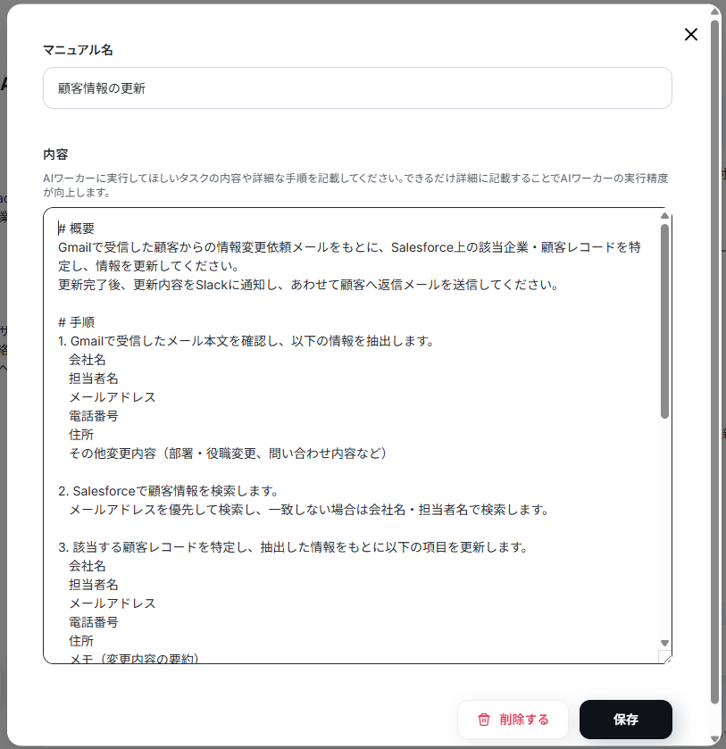 AIワーカーが業務を迷わず遂行できるように、行動のルールを記した「マニュアル」を設定します。