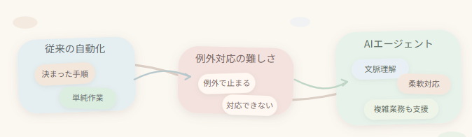 これまでのITツールやRPAでも業務効率化は進められてきましたが、例外的な処理に弱く、あらかじめ決められたルール通りの単純作業しか自動化できないという課題がありました。