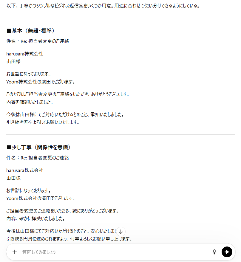 1分程度で2パターンの返信内容が作成されました。