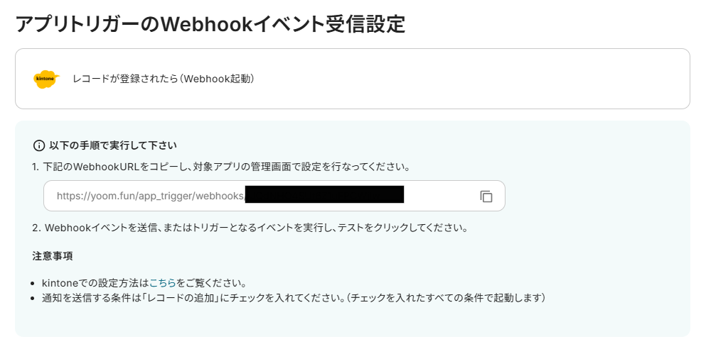 3.以下の画面が表示されるので、赤枠をクリックしてWebhook URLをコピーします。 コピーが完了したら、こちら を参考にkintoneの管理画面で設定しましょう。