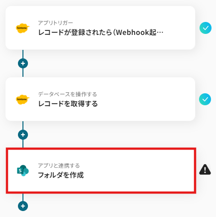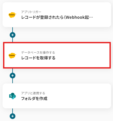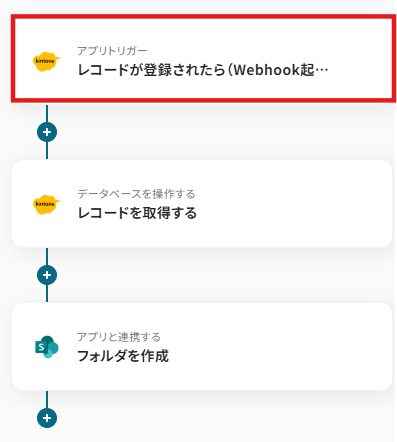 kintoneに新しく取引先のレコードが登録されたら、Microsoft SharePointに取引先名のフォルダを新たに作成するフローです。