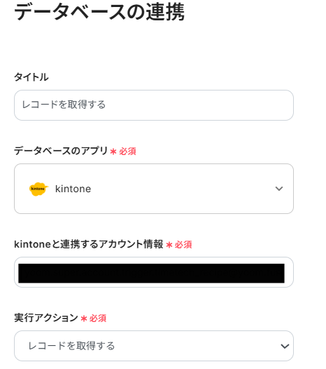 2.以下の画面でYoomと連携するアカウントを選択します。 先ほどと同様にタイトルと連携するアカウント情報を任意で設定し、アクションはテンプレート通りに「レコードを取得する」のまま、下にスクロールしましょう。
