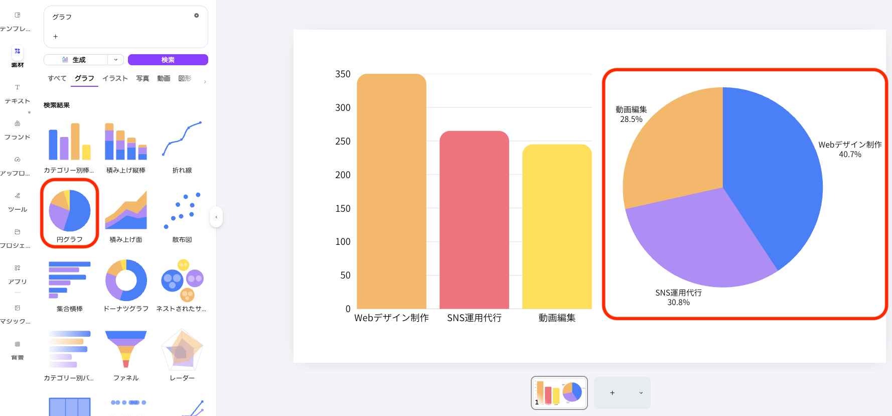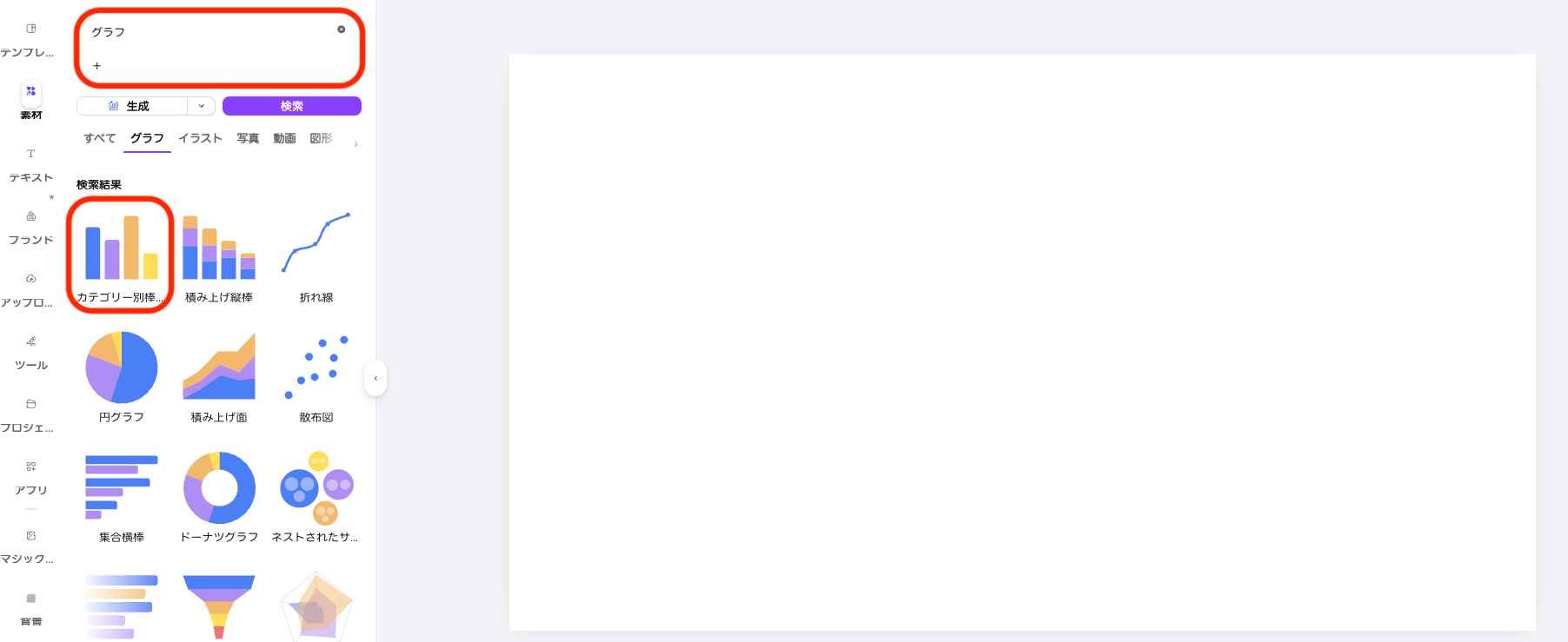 手順1. Canvaで「プレゼンテーション」を開き、左メニューの「素材」からグラフを検索