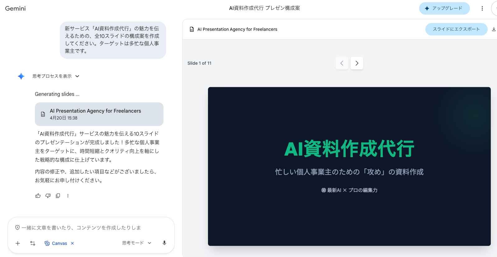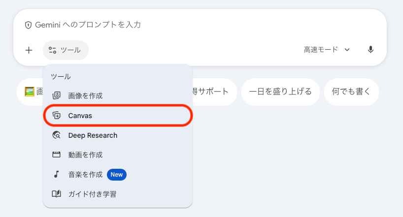 Geminiのプロンプト入力欄の下部にある「Canvas」というオプションをオンにしてから、作成したい内容の指示を送信します。