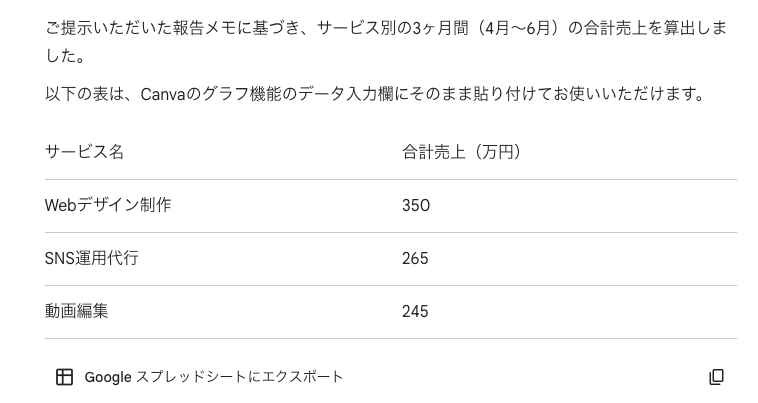 特に、Geminiで数値を整理してからCanvaで可視化する流れは、資料作成の時短に役立ちます。